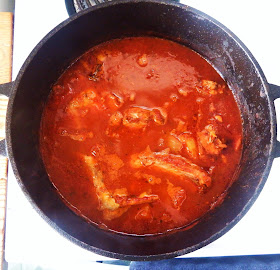 If rabbit isn't your thing, don't worry, you can use a whole, butchered chicken instead. just cut the cooking time in half because chicken doesn't need as long to cook as rabbit. If you've never tried rabbit and are curious about what it's like, it has a slightly gamey flavour but it is overall quite mild. Not to be confused with hare, which to my understanding does have a stronger flavour). It's a white meat animal that's very lean. It is similar to poultry. They have some pesky bones that you may not be used to and it has less meat to bone ratio than a chicken, but it's a nice change once in a while. The extra bones do provide more flavour to the simmering sauce, as they would in a stock.